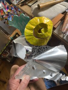 Weil ich keine Maschinen verwende um das langsame Klären der Form bewußt zu begleiten, ziehen sich die Produktionszeiten in die Länge. Der Vorteil ist der intensive Austausch von Vorstellung und Produktion (Schnitzen). Es ist also nicht so, dass die Zeit handwerklich, d.h.beim Herstellen eines ´Stückes’ verbraucht wird, sondern ohne definiertes Ziel beim Schnitzen “verrinnt”. Hier komme ich zur Vorstellung, dass Zeit beim Schnitzen entsteht. Zeit bedeutet dann, dass jeder Schritt nicht nur Zeit, sondern seine eigene Zeit hat. Diese Zeit ist untrennbar mit der Form, dem sich verändernden Material (Form) verbunden. So gesehen gibt es eine “plastische Zeit”. Wahrscheinlich verhake ich mich hier in einer schon bestehenden Zeit-Theorie. Schon der Gedanke an ein Blatt, das vom Baum fällt oder ‘segelt’, läßt an Galileo denken. Möglicherweise geht es bei meiner Beobachtung um die erlebte Zeit beim Schnitzen und nicht um die Fertigung eines Produkts.